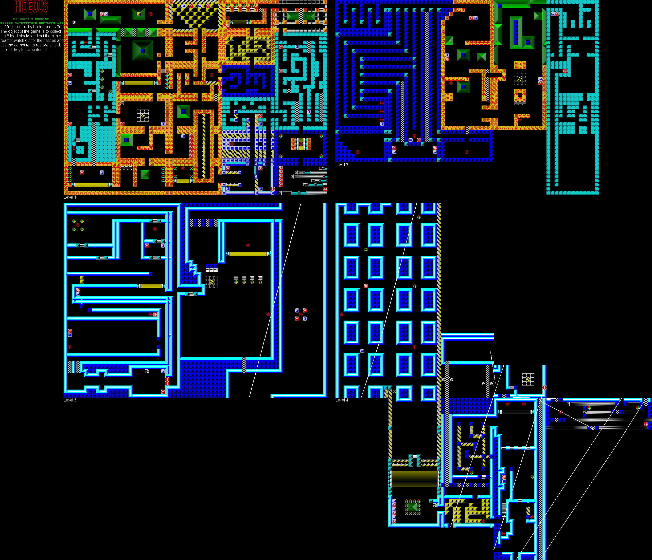 Level 1: http://www.worldofspectrum.org/pub/sinclair/games-maps/h/Hideous.jpg